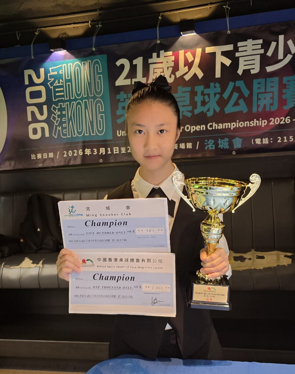 本校陳立言同學(2B)於「2026 香港 21 歲以下青少年英式桌球公開賽 – 第一站」榮獲女子組冠軍,恭喜!