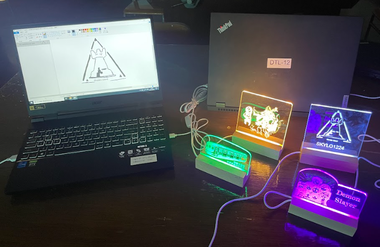 LED Display Signs: Students made laser engraved clear acrylic and paired it with electronic bases to create vibrant, glowing neon-style signs.